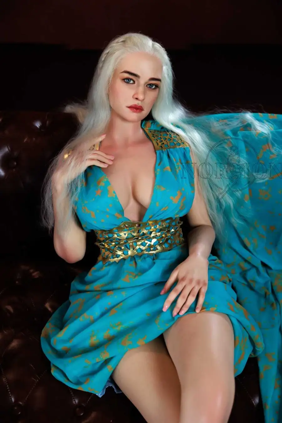 Step into a realm of fantasy with Rhaenyra, the Queen Dragon Rider, an ethereal beauty who radiates elegance, strength, and desire. With her flowing platinum hair and royal teal gown detailed in gold, she embodies the spirit of a mystical queen ready to rule your heart and your imagination.